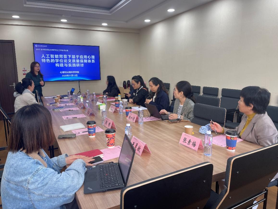 2025年11月13日上午,华东师范大学研究生工作秘书沙龙“人工智能背景下基于应用心理特色的学位论文质量保障体系构建与实践研讨”在俊秀楼313顺利举行。活动旨在搭建跨院系交流平台,探讨人工智能背景下学位论文质量保障与实践成果评价的创新路径。华东师范大学学位管理办公室张寅艳、经济与管理学院牟昱洁、计算机科学与技术学院彭艳霞、国际汉语文化学院孙辛昕、教育学部教学事务部姚一洁、公共管理学院张素梅受邀出席,心理与认知科学学院MAP中心副主任汪红英及全体研究生秘书共同参与。活动由心理与认知科学学院研究生秘书郭琼主持。